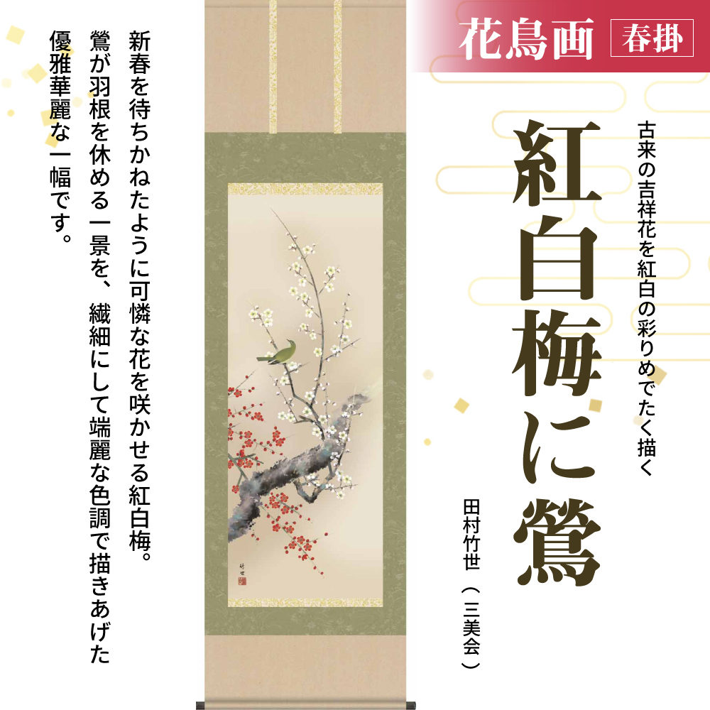 紅白梅に鶯【田村竹世】 商品コード: sud-0001 SALE オンラインショップOPEN記念価格:24,750円(税込) ●幅54.5×高さ190㎝ ●本紙 新絹本 ●軸先 陶器 ●桐箱畳紙収納 ●表装品質十年間保証付き 7営業日以内に発送39,600円 元の価格は 39,600円 でした。24,570円現在の価格は 24,570円 です。 (税込) 紅白梅に鶯【田村竹世】個 カートに入れる 紅白梅に鶯【田村竹世】個 カートに入れる 説明 田村竹世 略歴:多摩美大卒業後、村内桃幸画伯の門を叩く。日本画の真髄を会得し、特に空間の美を重視した構図の素晴らしさに定評がある。